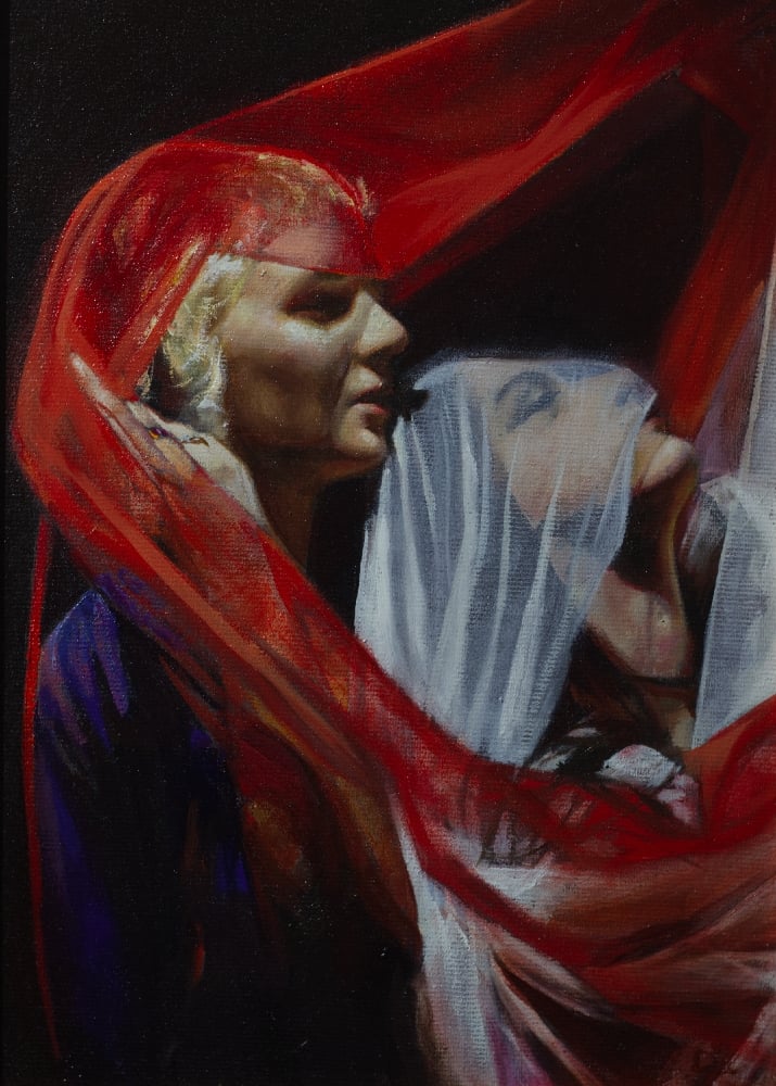 Oil on canvas wood panel, framed in deepset black wooden frame with gold inlay